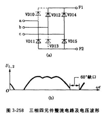 順便指出,如果正極或負(fù)極都不相連的兩個(gè) 整流管,如圖3-258a中VD10、VD13 (虛線(xiàn)部分)損壞,將VD10、VD13拆除,而不進(jìn)行元 件移補(bǔ),則其電路和電壓波形如圖3-258b所示, 其輸出電壓數(shù)值上與單相橋式整流輸出電壓相 等,但波形有所不同,每個(gè)周期有60°缺口。