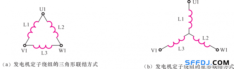 發(fā)電機(jī)的定子接法主要可以分為兩種,即三角形(△形)聯(lián)結(jié)和星形(Y形)聯(lián)結(jié),如圖9所示。在發(fā)電機(jī)中,通常發(fā)電機(jī)定子的3個(gè)繞組一般都聯(lián)結(jié)成星形。