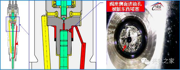 1)閥座進(jìn)油口堵有顆粒,閥桿端和油嘴端油壓嚴(yán)重失衡,閥桿無法落座,導(dǎo)致噴油器常噴,進(jìn)而軌壓上不去。