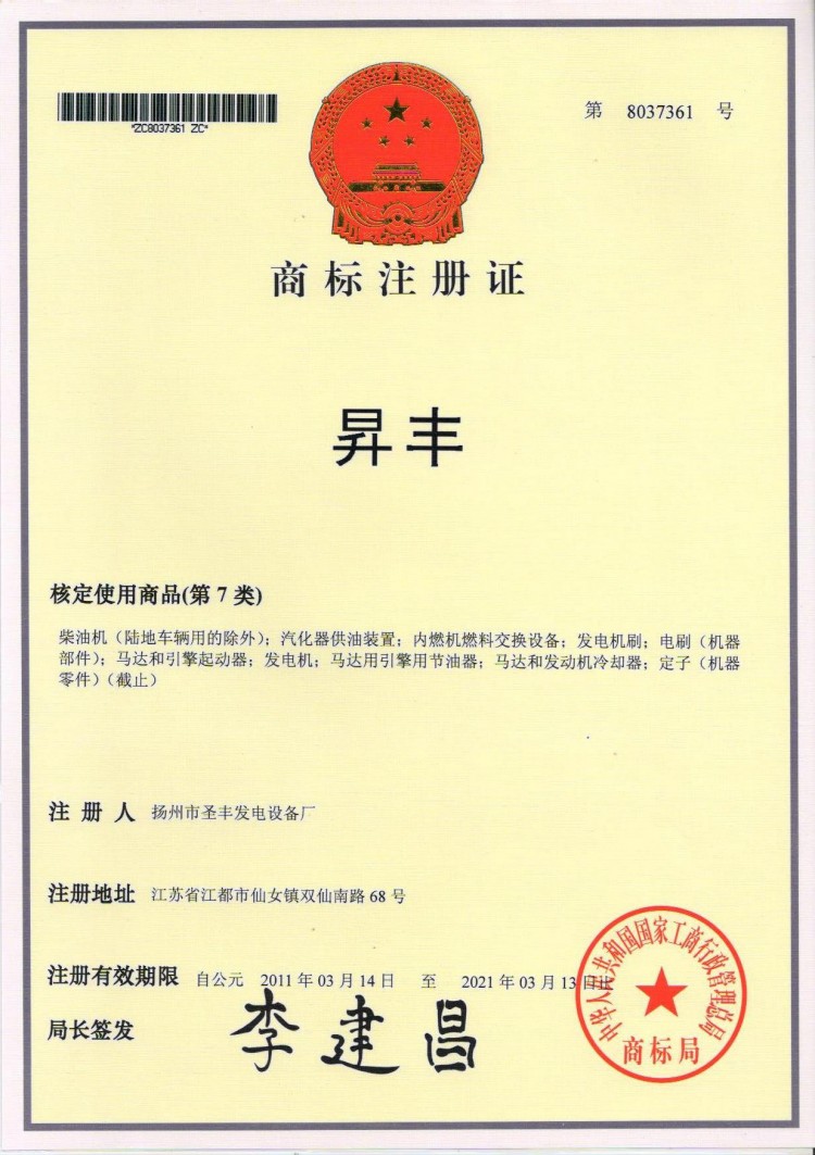 圣豐商標(biāo)注冊(cè)證