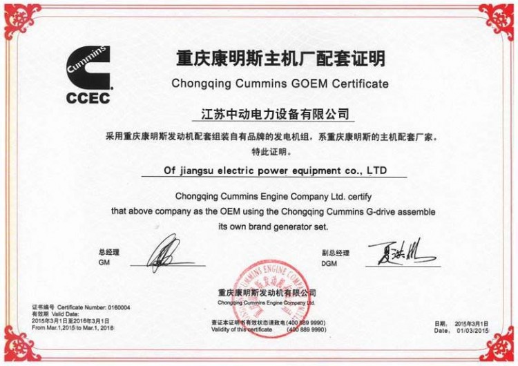 重慶康明斯動力配套發(fā)動機有限公司授權(quán)江蘇中動電力設(shè)備有限公司作為柴油機配套商