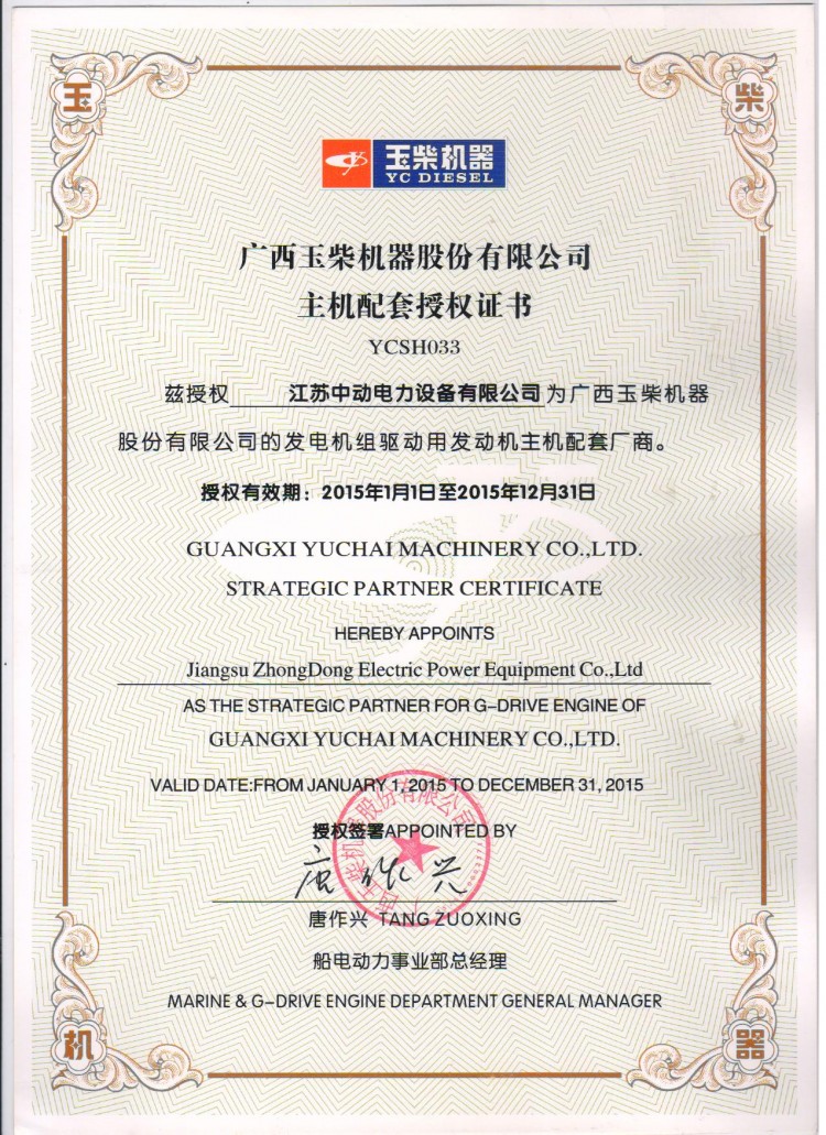 廣西玉柴機器股份有限公司授權江蘇中動電力設備有限公司作為柴油機配套商