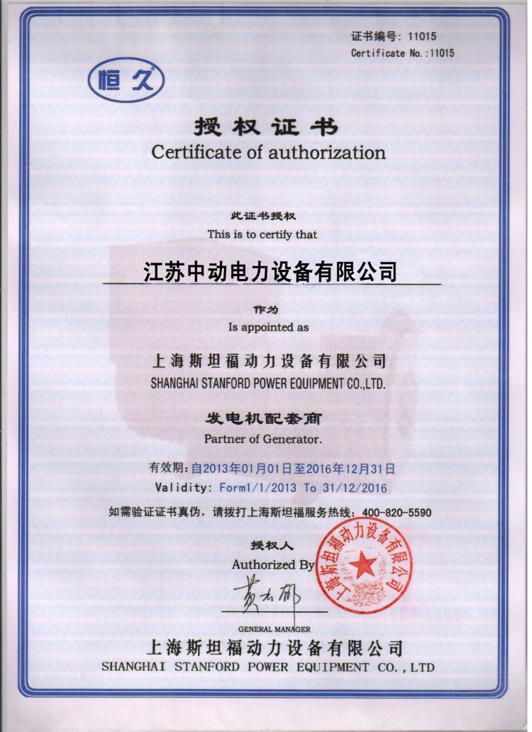 上海斯坦福動力設備有限公司授權江蘇中動電力設備有限公司作為發(fā)電機配套商